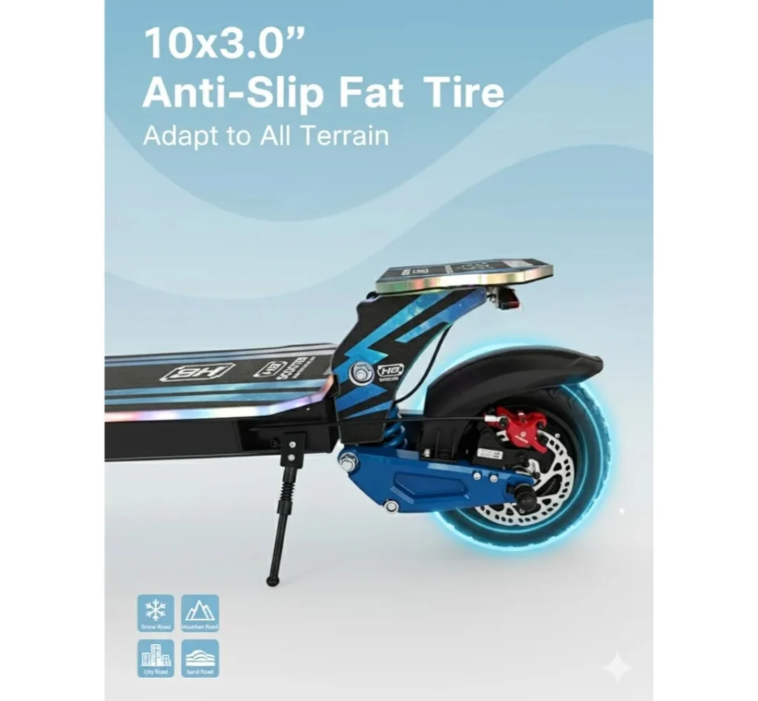 Built with a durable aluminum alloy frame, dual suspension system, and 10x3-inch tires, it ensures a smooth and stable ride across city roads and off-road tracks. Safety is maximized with front and rear disc brakes, while the RGB lights and big digital display provide visibility, style, and real-time riding data.