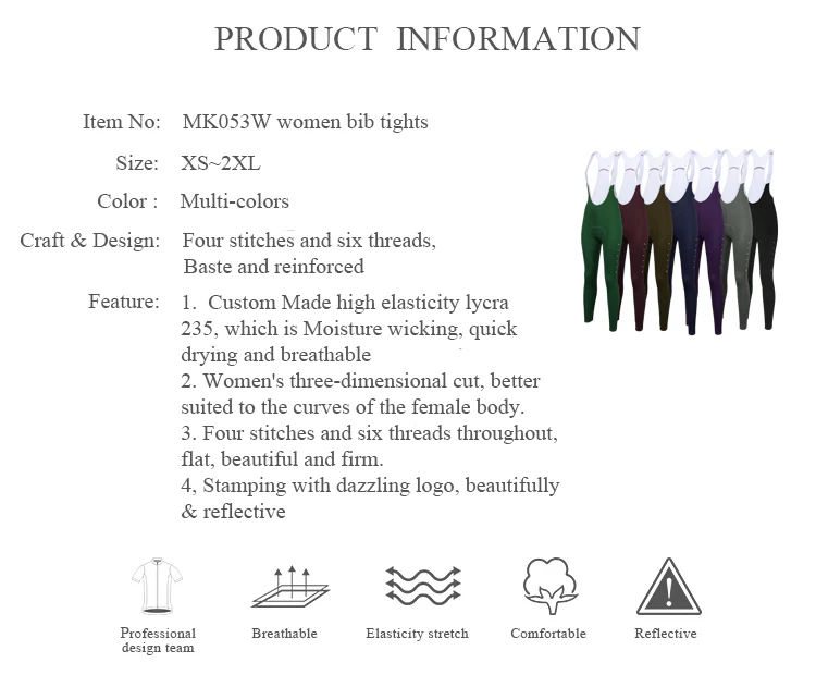 Designed for performance and comfort, these women’s cycling bib tights feature high-density nylon Lycra fabric that combines elasticity, breathability, and quick-drying properties. The ergonomic 3D cut ensures a snug fit that moves with you, while the women-specific Belgian sponge chamois provides lasting comfort on long rides. Finished with four-needle six-thread stitching for durability and a reflective logo for added safety, these bib tights are built to perform in every ride.