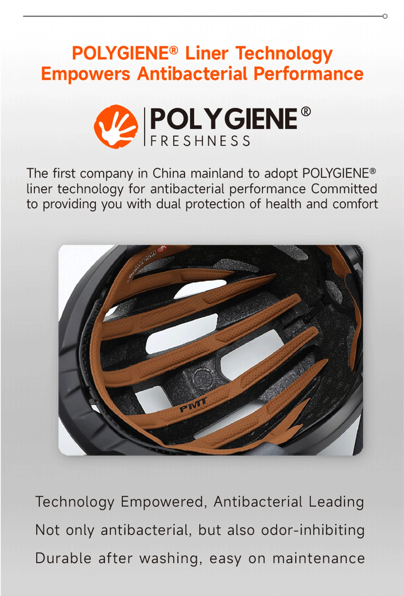 POLYGIENE® Liner Technology: Empowers antibacterial performance. The first company in China mainland to adopt this technology.