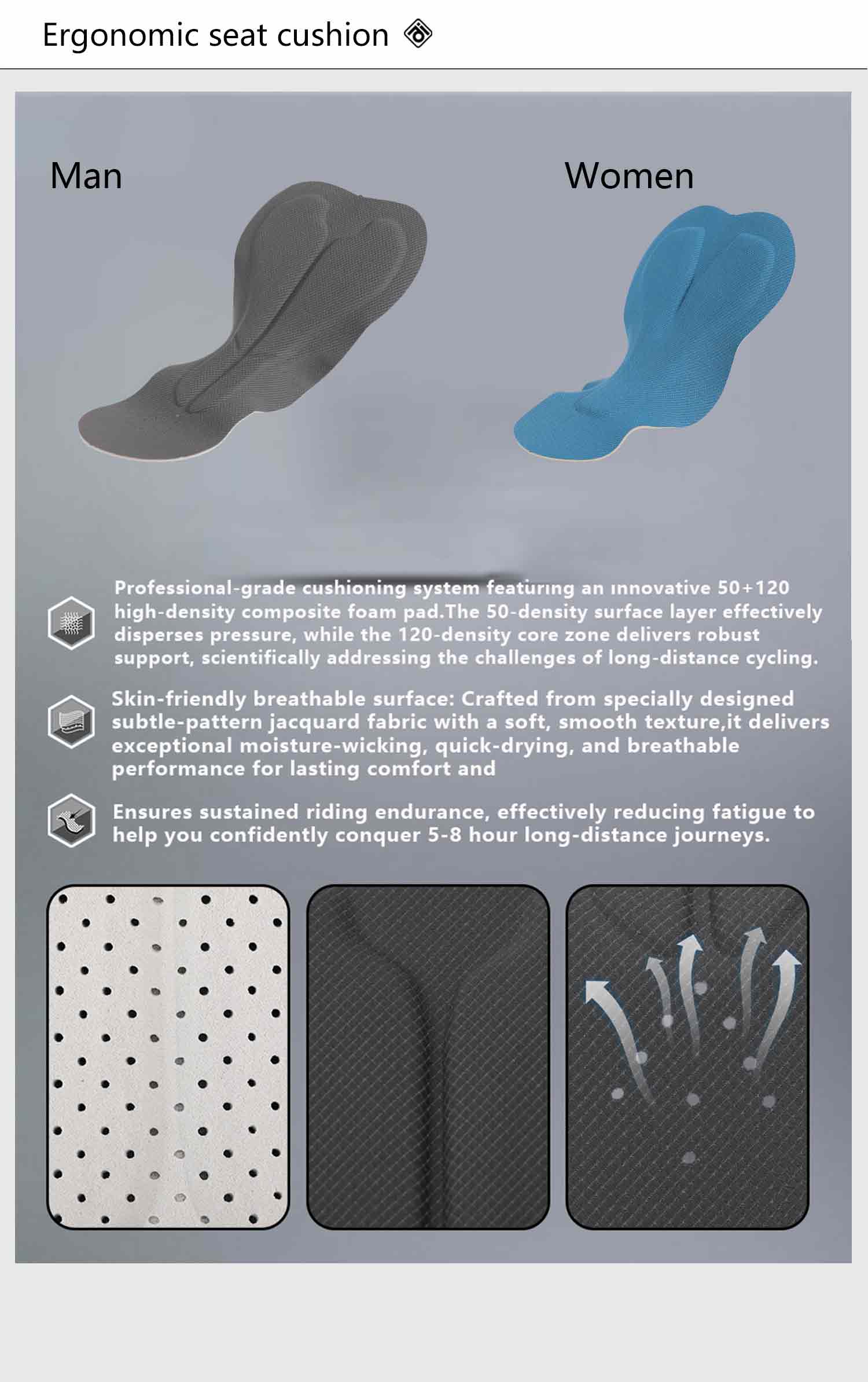 Innovative Dual-Density Cushioning (50+120) Experience a scientific approach to comfort. Our professional-grade pad combines a 50-density surface layer to disperse skin-level pressure with a 120-density core zone for robust skeletal support—specifically engineered for long-distance cycling.
