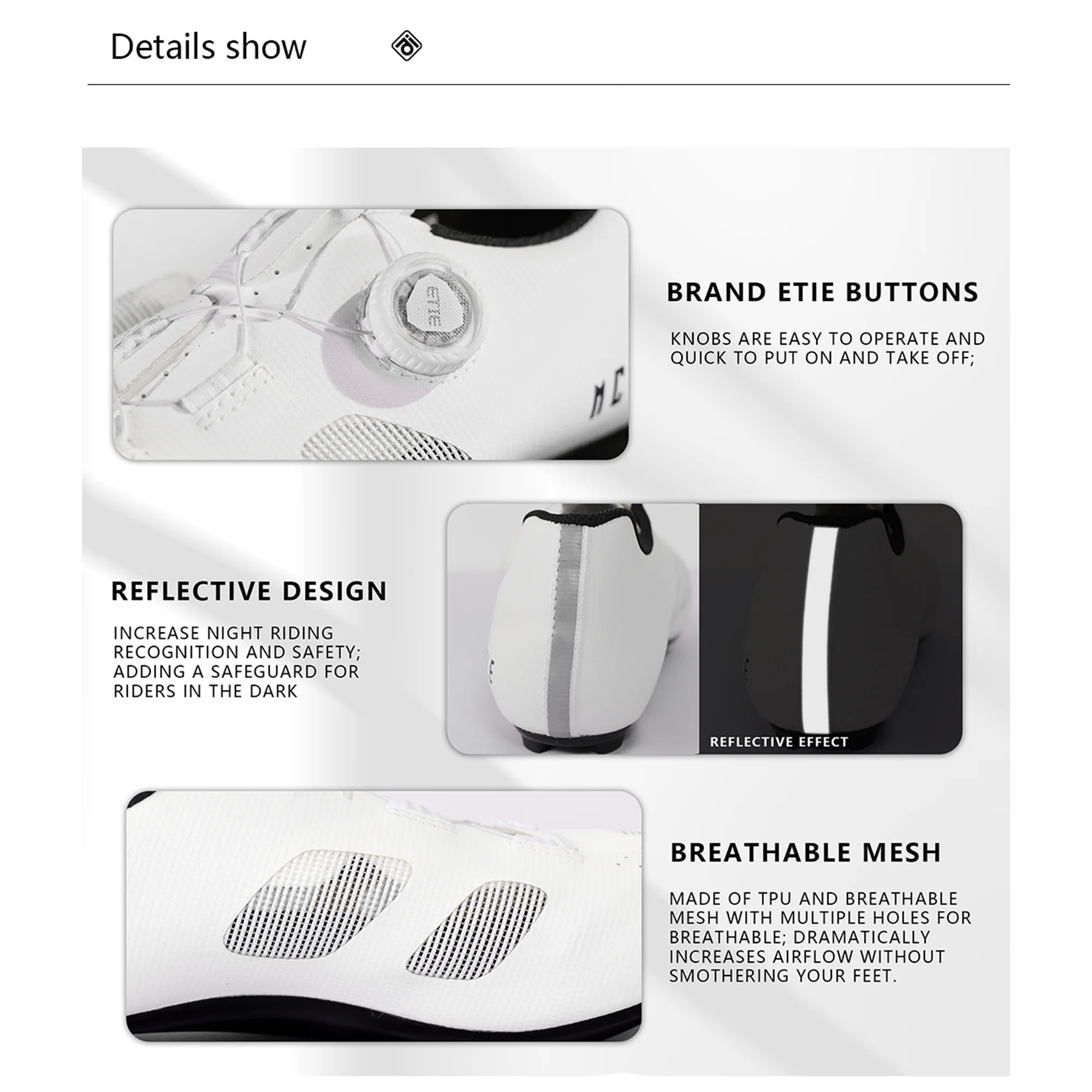 3. Reflective design on the heel increases night riding recognition and improves safety;
