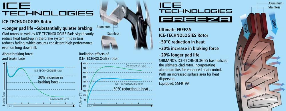 SHIMANO’s ICE TECHNOLOGIES has realized the ultimate clad rotor, incorporating aluminum fins for enhanced heat control. With an increased surface area for heat dispersion, the rotor achieves a 50°C reduction in heat. This in turn generates a 20% increase in braking force durability and a 20% longer pad life.