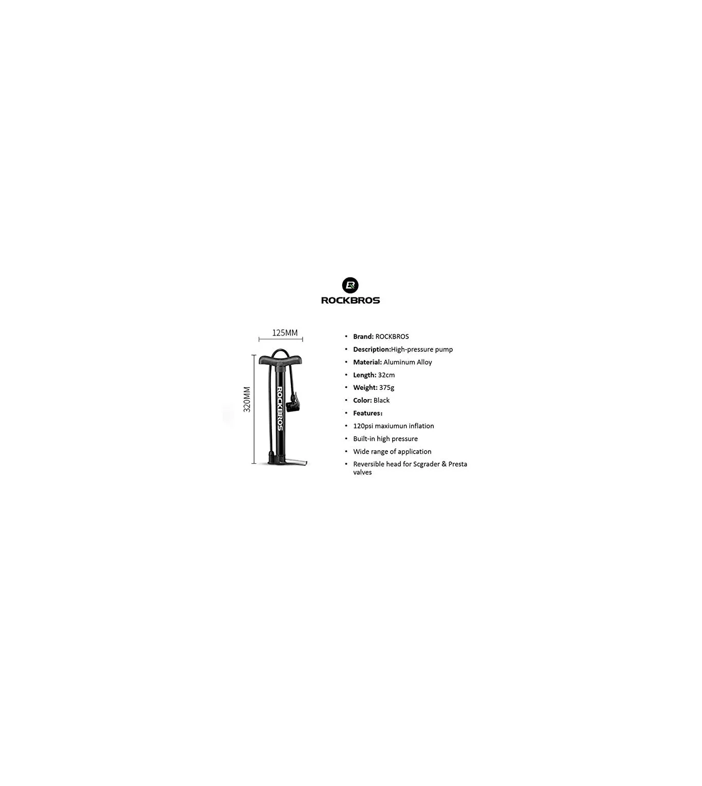 • Mini size and lightweight: The ROCKBROS Small Bicycle Pump is designed to be compact and portable, with a mini size of 125mm and a weight of only 375g. This makes it easy to store and carry with you on the go. It can fit easily in a backpack